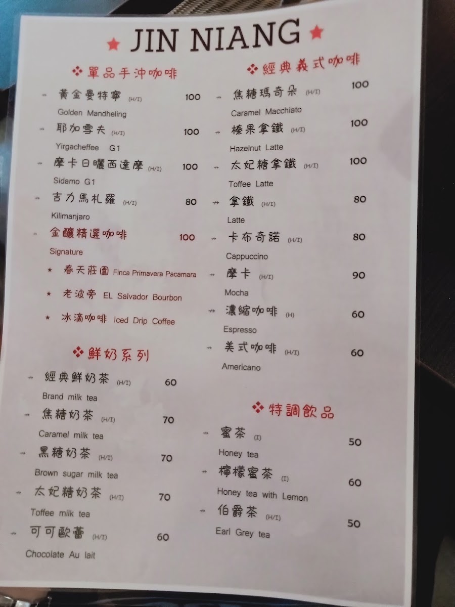 金釀咖啡館 Jin-Niang Café Menu